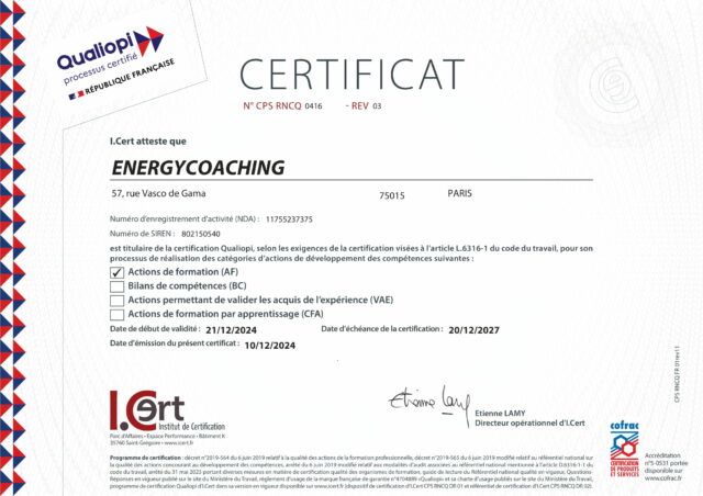 QUALIOPI depuis 21 Décembre 2020 : I.Cert certifie que les catégories d’action de formation réalisées par Energycoaching concourant au développement des compétences sont conformes aux exigences de la certification requises par le décret n°2019-564 du 6 juin 2019 relatif à la qualité des actions de la formation professionnelle, décret n°2019-565 du 6 juin 2019 NPEJGJÏrelatif au référentiel national sur la qualité des actions concourant au développement des compétences, arrêté du 6 juin 2019 NPEJGJÏrelatif aux modalités d’audit associées au référentiel national mentionné à l’article D.6316-1-1 du code du travail, guide de lecture du Référentiel national qualité en vigueur, dispositif de certification d’I.Cert en vigueur CPS RNCQ DR 01 et le référentiel de certification d’I.Cert en vigueur CPS RNCQ DR 02.
